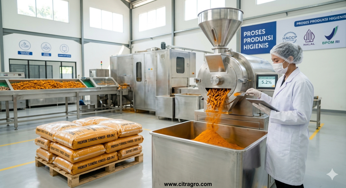 Seluruh rangkaian proses ini dijalankan di bawah pengawasan ketat standar HACCP (Hazard Analysis and Critical Control Points) untuk memastikan bahwa setiap gram kunyit bubuk yang keluar dari pabrik kami adalah produk yang aman, murni, dan layak untuk pasar internasional.